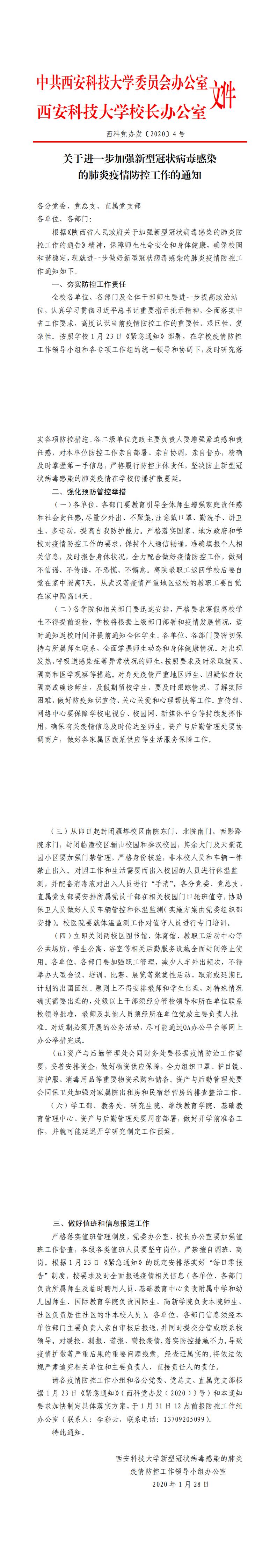 关于进一步加强新型冠状病毒感染的肺炎疫情防控工作的通知(西科党办发〔2020〕4号)