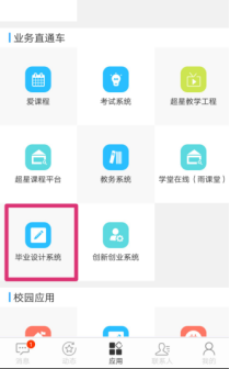 3.进入“西科教务”,在屏幕下方打开“应用”,在“业务直通车”中打开“毕业设计系统”即可。初次登录“大学生毕业设计(论文)管理系统”,需要绑定手机号以及修改系统密码,原密码请输入“统一身份认证密码”,新密码自行设定即可。