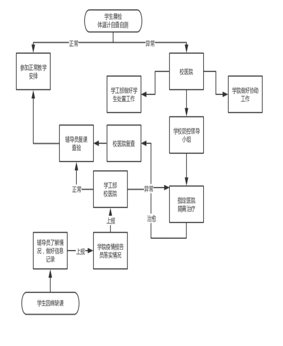 5.日常公寓管理。公寓工作人员测量体温,体温正常→刷卡通过门禁后进入公寓;为最大限度避免交叉,学生只能所居住公寓进出,不允许出现串门、聚集等违反疫情防控的情况;取消访客制度,禁止外来人员进出学生公寓。