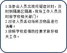 2.如果有可疑症状,应避免进入教学区域。体温异常,按相关程序应急处置,发现人员第一时间报辅导员和校医院刘曦18629339730。